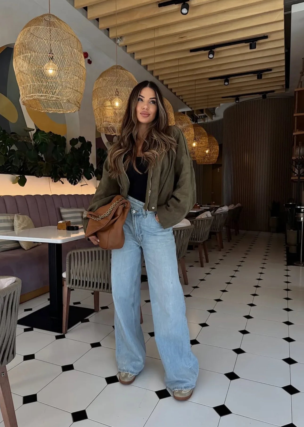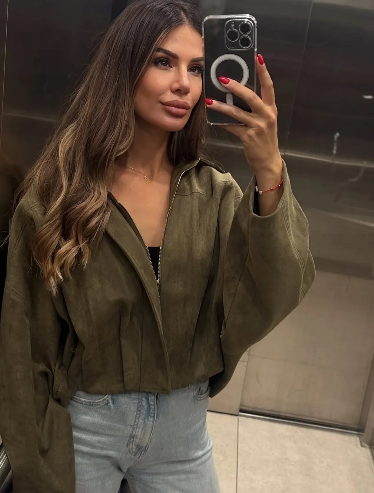 Jachetă Bomber Olive Luxe – statement-ul perfect pentru un look sofisticat și relaxat.