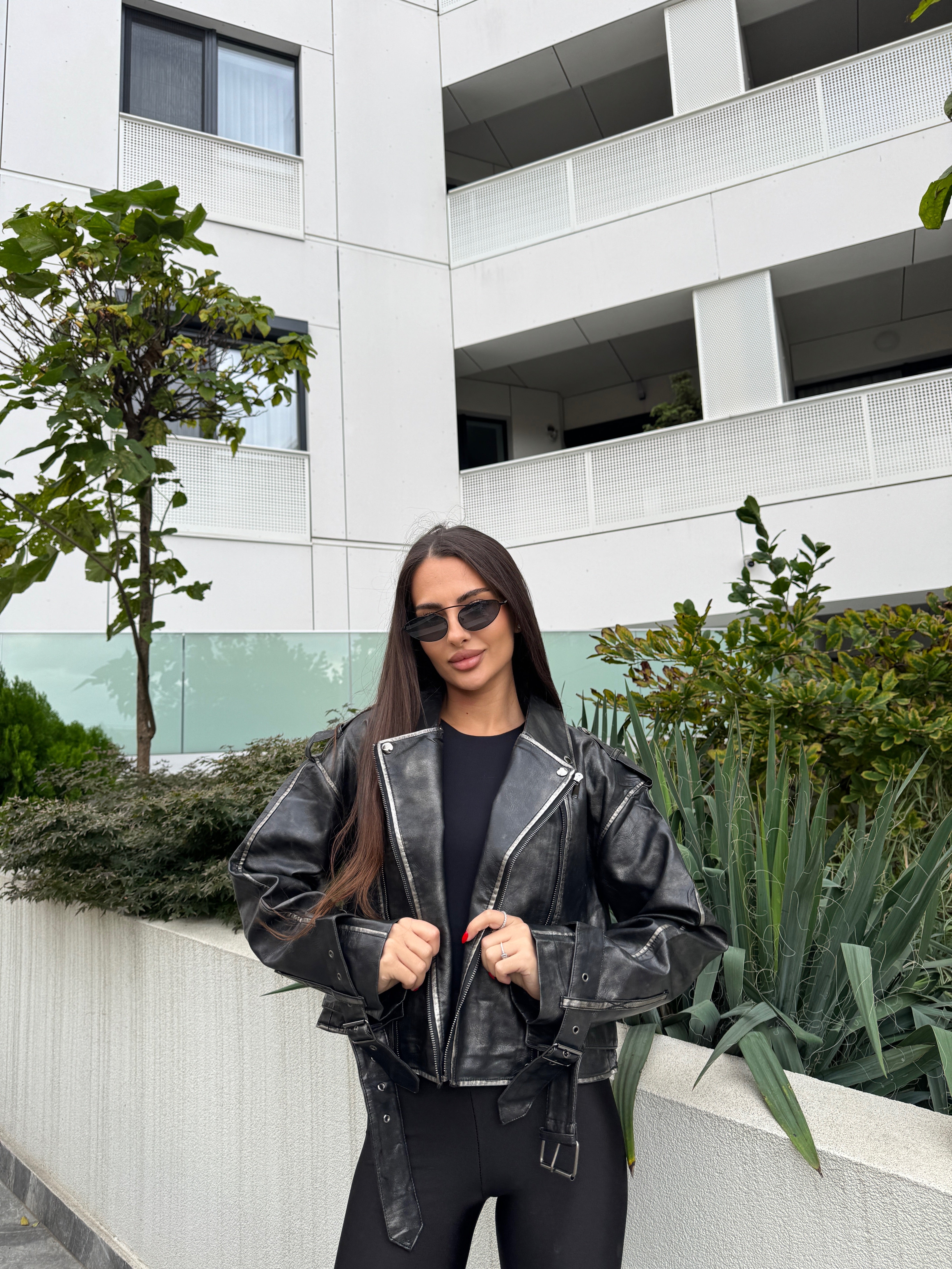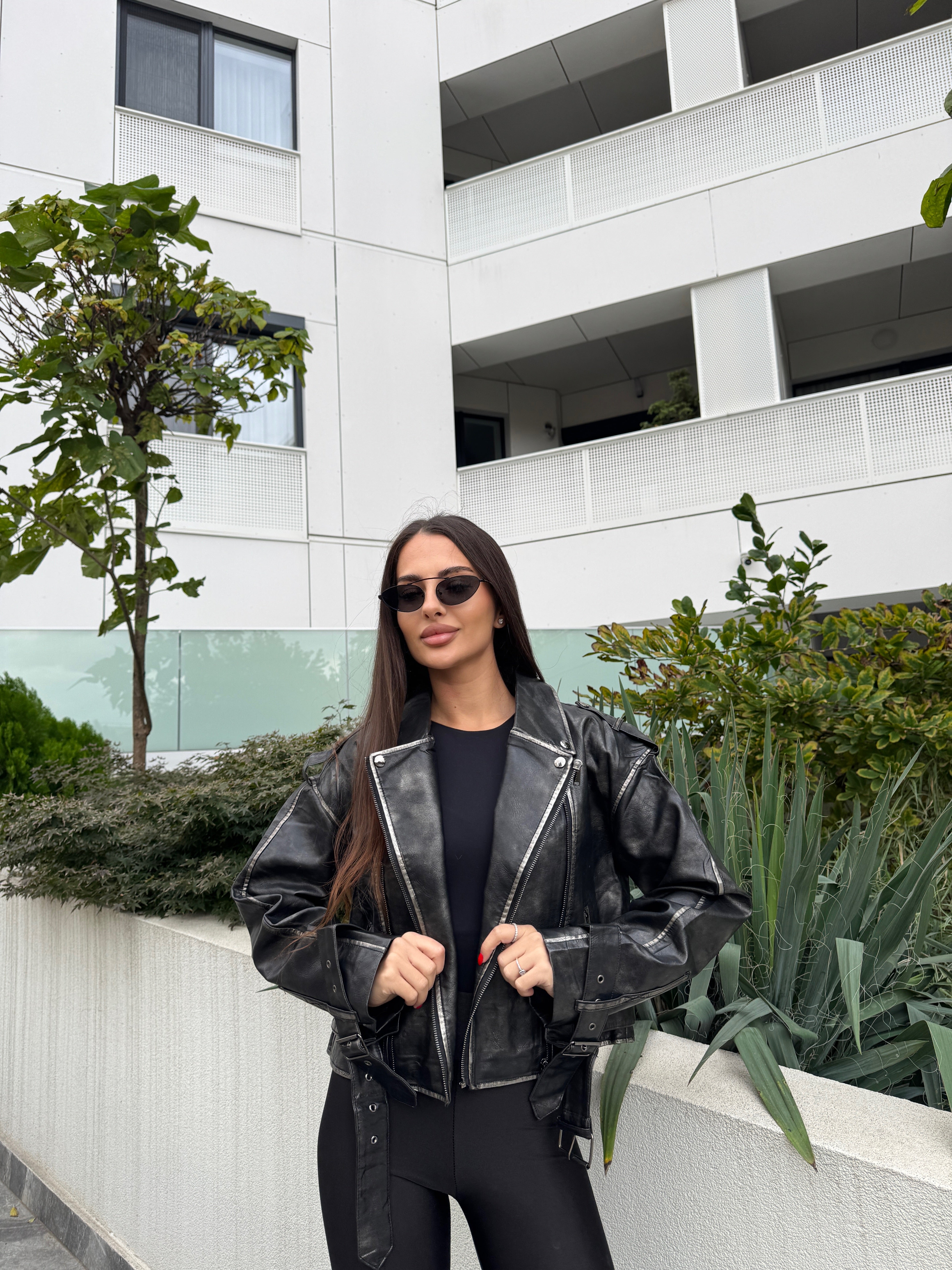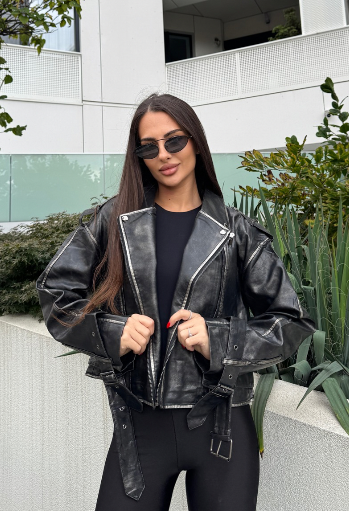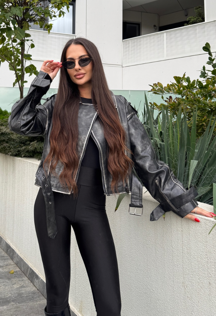 Jacheta “Rebel Edge” adaugă o notă cool și sofisticată oricărei ținute. Realizată din piele eco premium, are un croi oversized cu detalii metalice și curele reglabile la mâneci și talie, pentru un look statement și versatil. Textura ușor mată oferă un aer urban chic, perfect pentru zilele răcoroase.