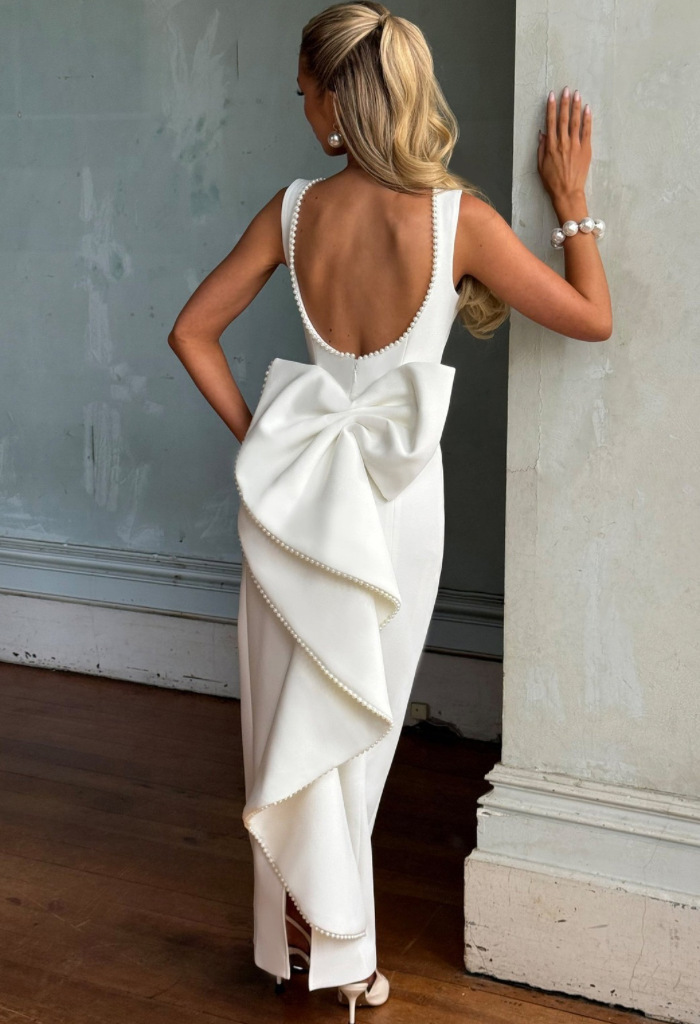 Rochie albă elegantă cu spatele gol și croi mulat – rafinament minimalist