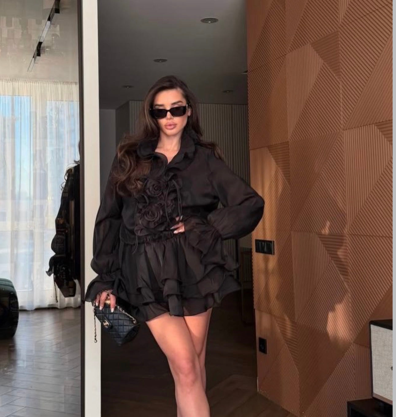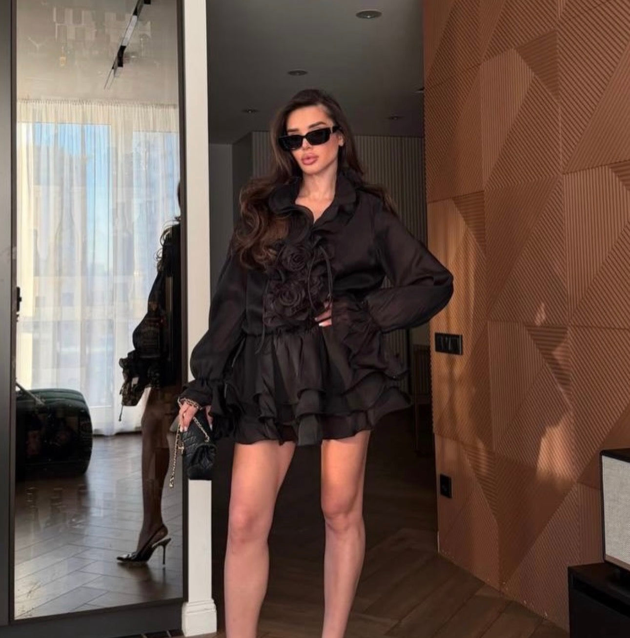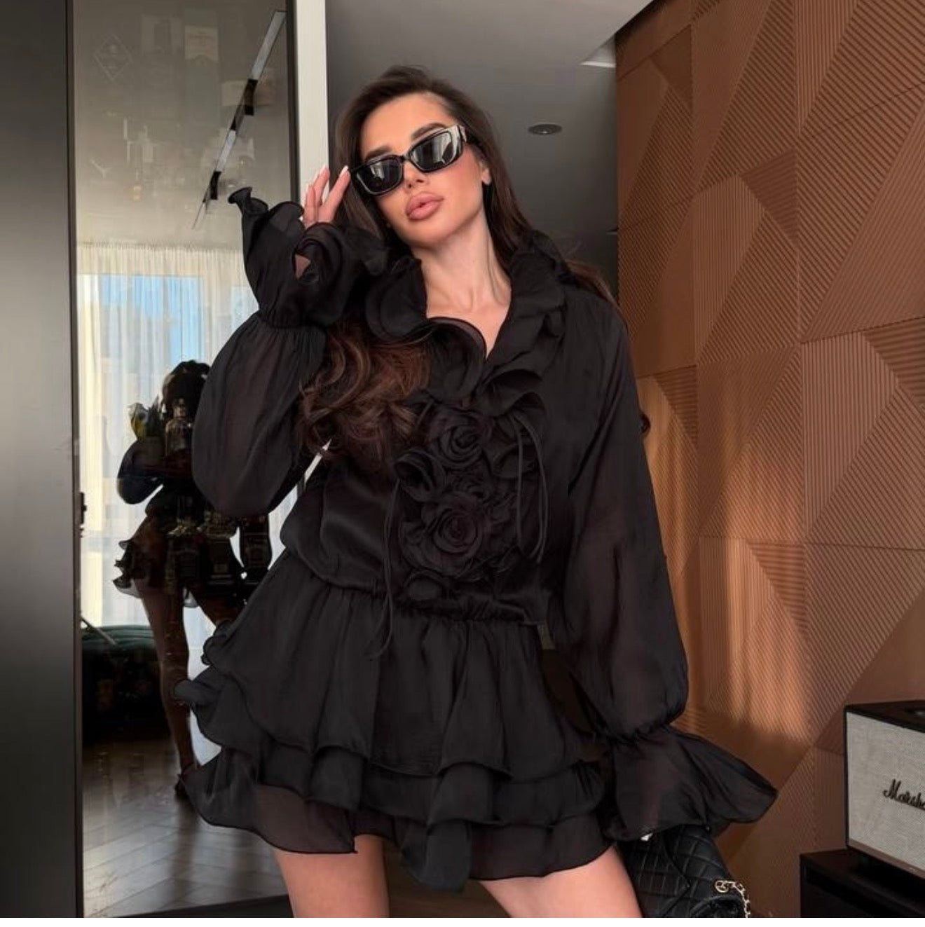 Mânecele lungi vaporoase sunt completate de detalii florale elegante, care transformă rochia într-o piesă statement, perfectă pentru evenimente, ieșiri în oraș sau ținute speciale.