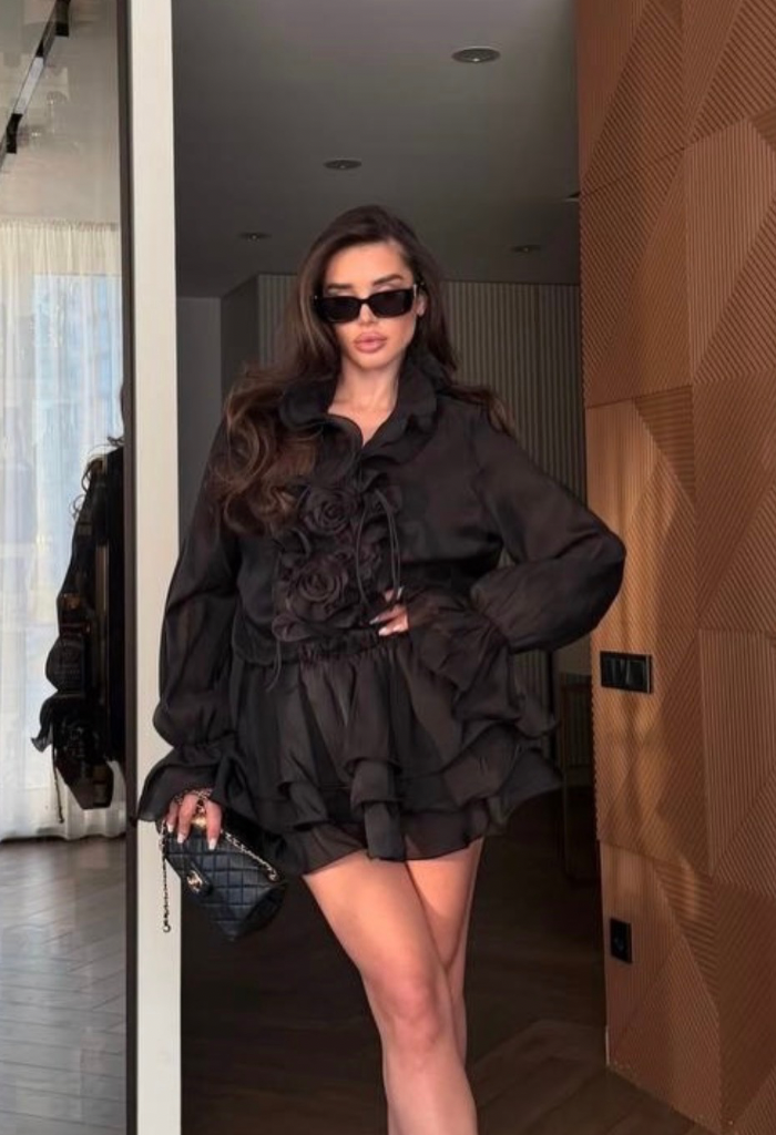 Decolteul cu șnur reglabil evidențiază bustul, iar talia elastică conturează frumos silueta, oferind în același timp confort la purtare. Fusta mini în straturi cu volane creează un efect fluid și ușor, ideal pentru un look chic și modern.