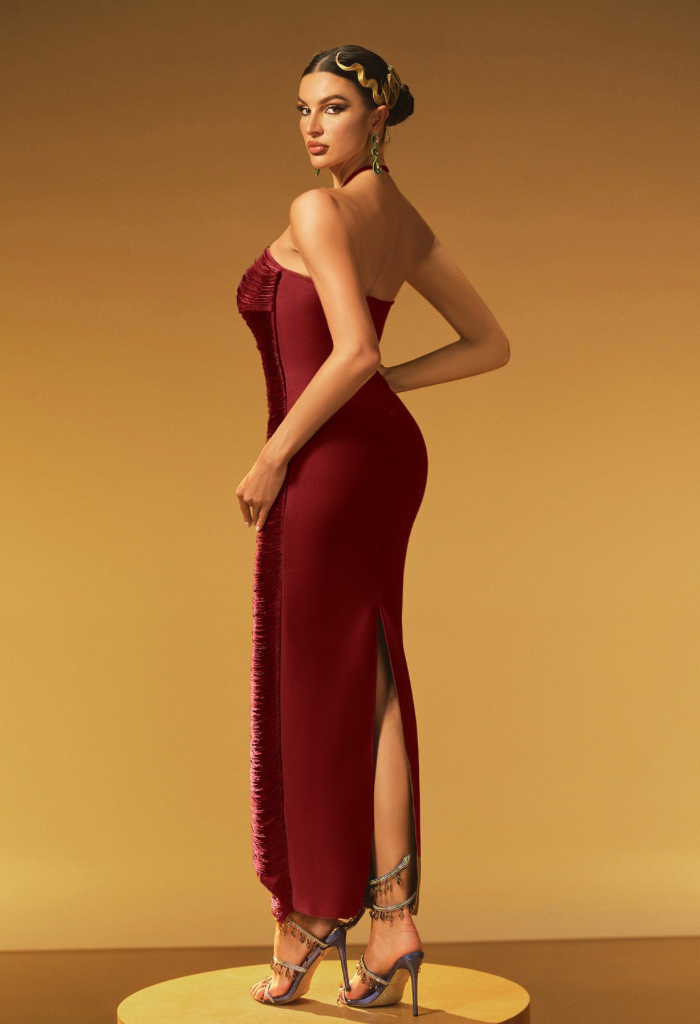 Designul halter pune în valoare linia umerilor și a gâtului, în timp ce textura plisată cu franjuri decorative creează un joc spectaculos de lumină și mișcare. Crapătura laterală adaugă un plus de senzualitate, păstrând rafinamentul unei rochii de lux.