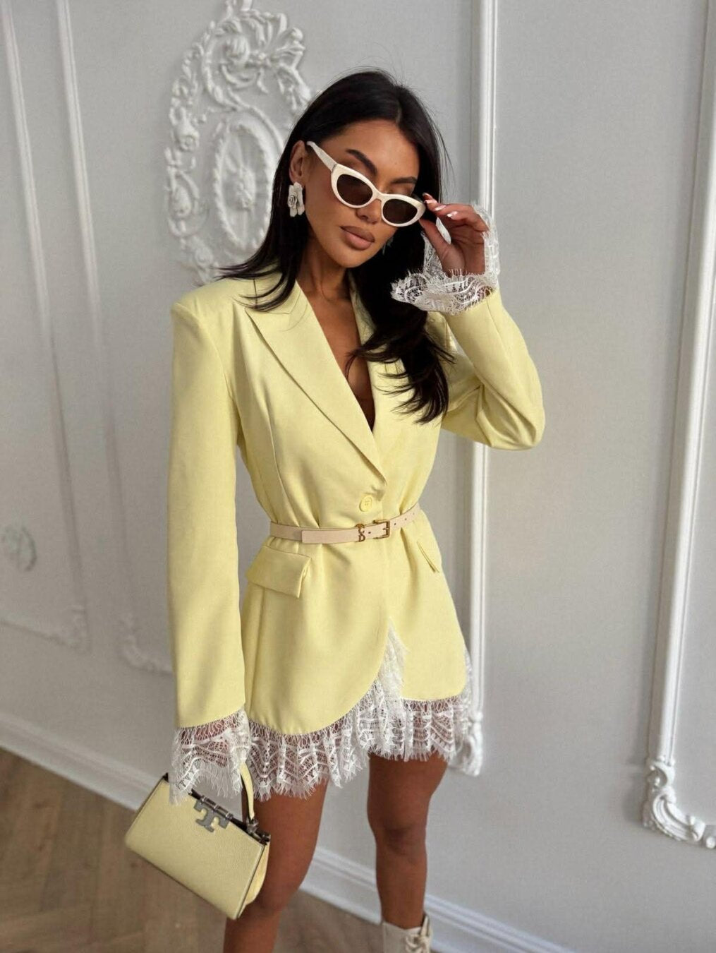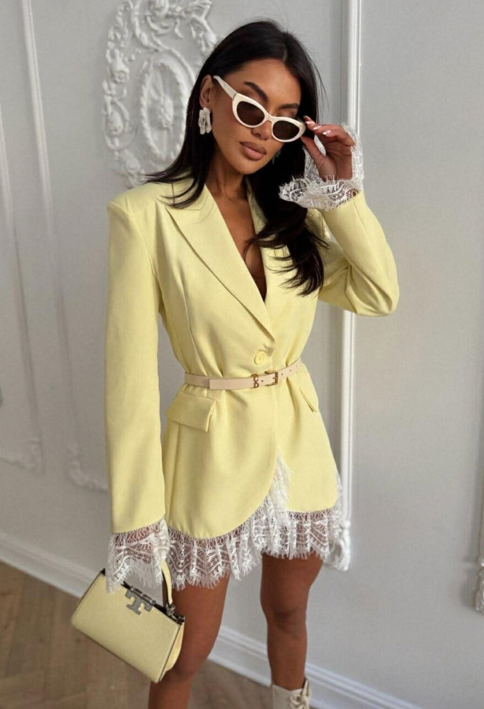 Transformă orice apariție într-o declarație de stil cu Sacoul Tip Rochie Laila, piesa care îmbină rafinamentul unui sacou clasic cu feminitatea unei rochii scurte. Un design premium, realizat pentru femeia modernă, sofisticată și încrezătoare.