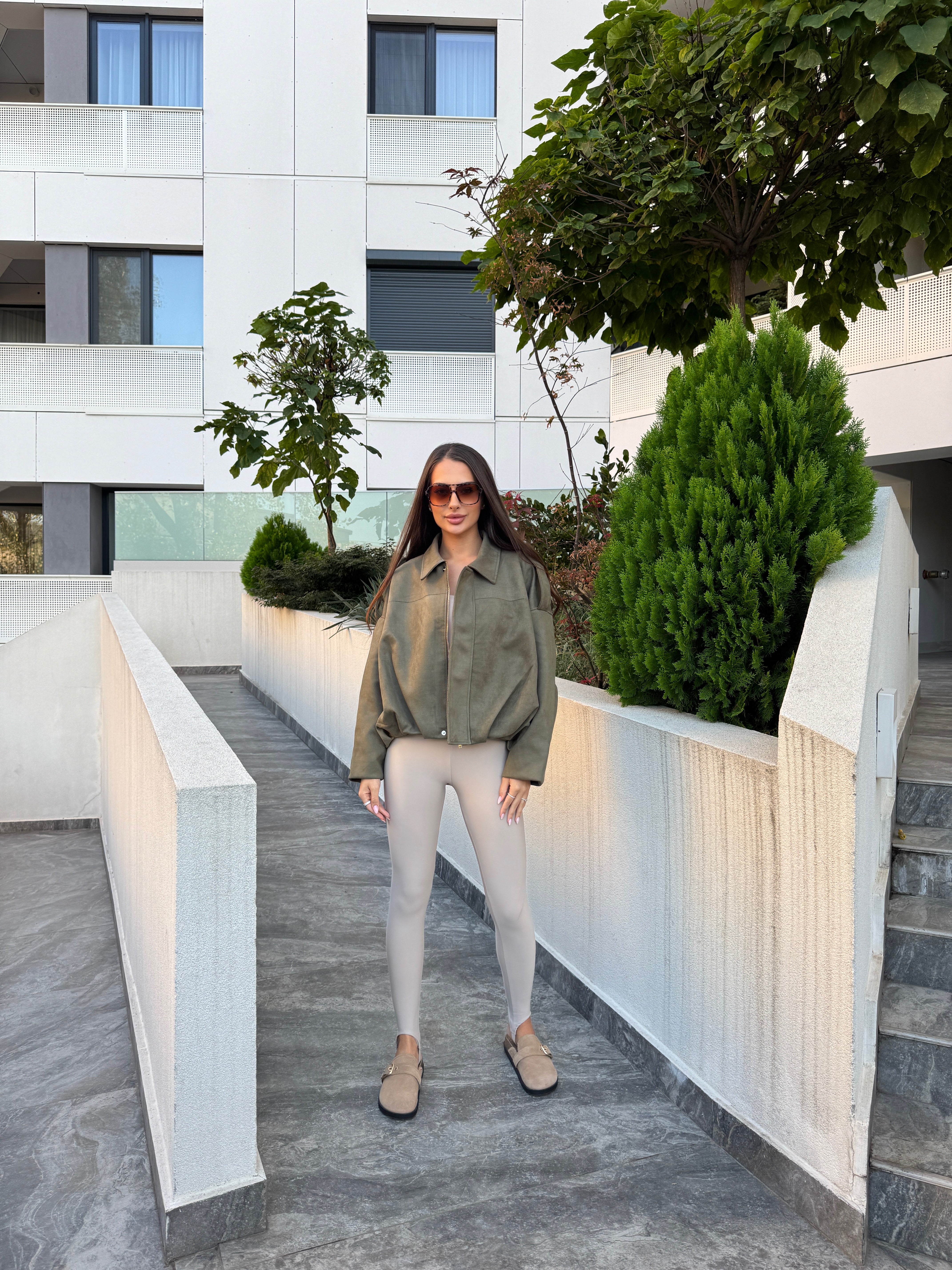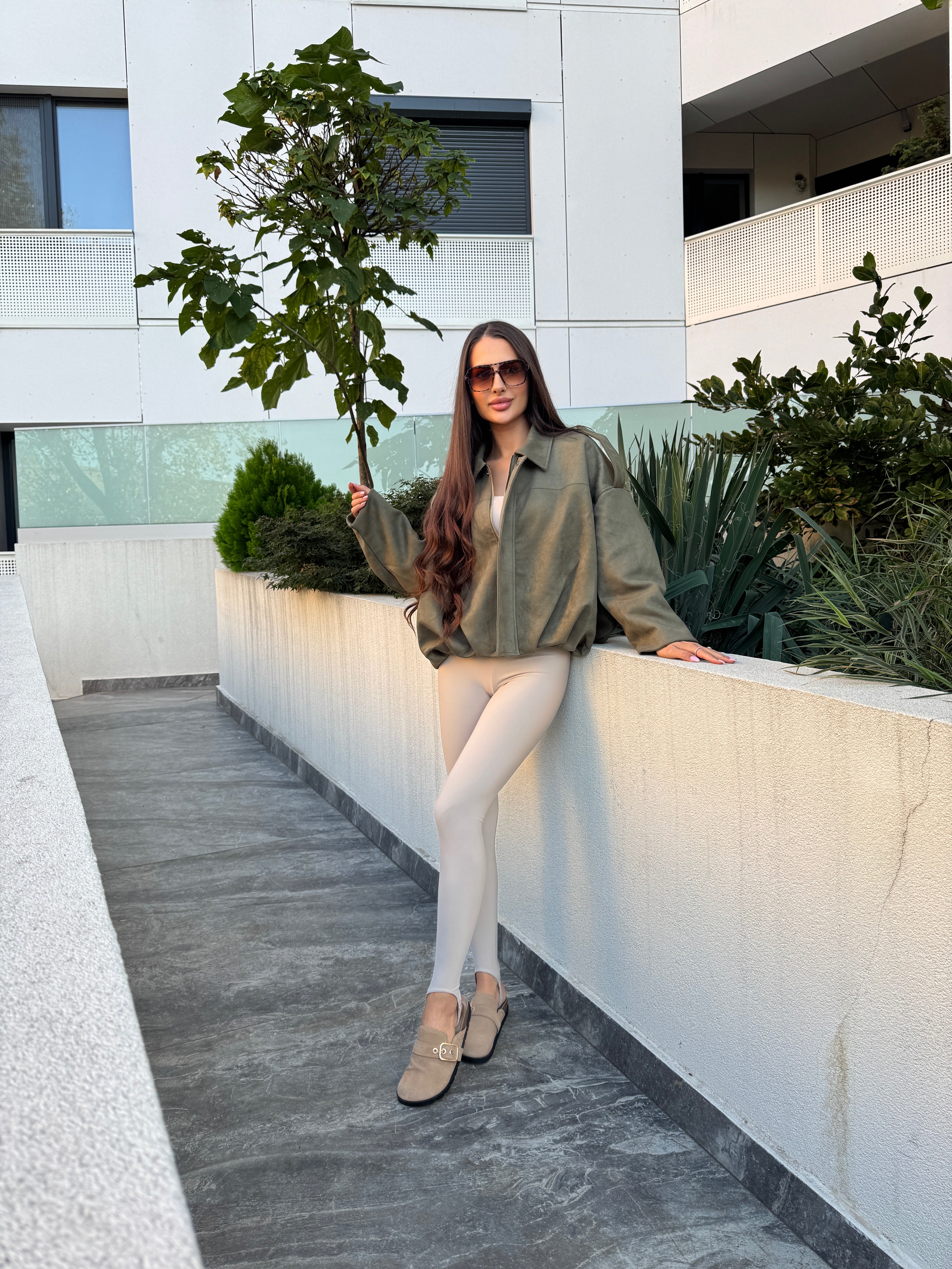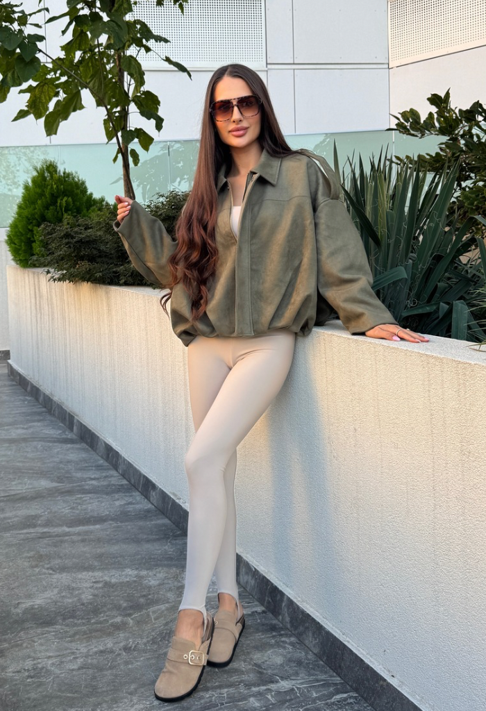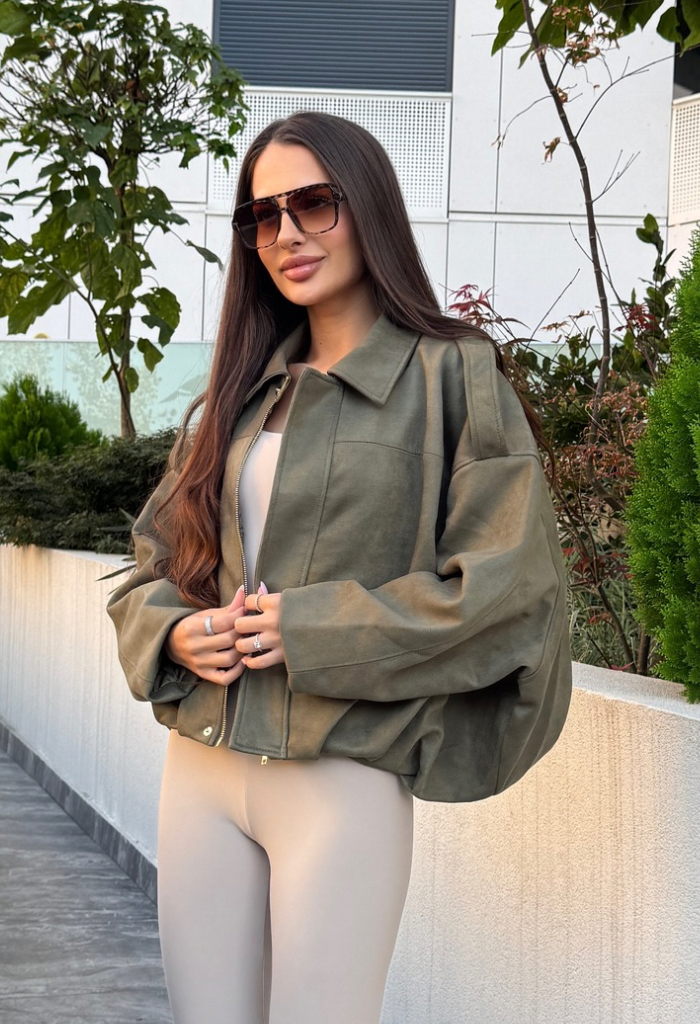 Realizată din material tip suede cu textură catifelată, această jachetă oversized în nuanță khaki-olive adaugă instant un aer cool și elegant oricărei ținute. Croiala lejeră și versatilă o face ideală pentru a fi purtată atât cu jeanși casual, cât și cu rochii sau pantaloni eleganți, în funcție de stilul pe care vrei să îl transmiți.