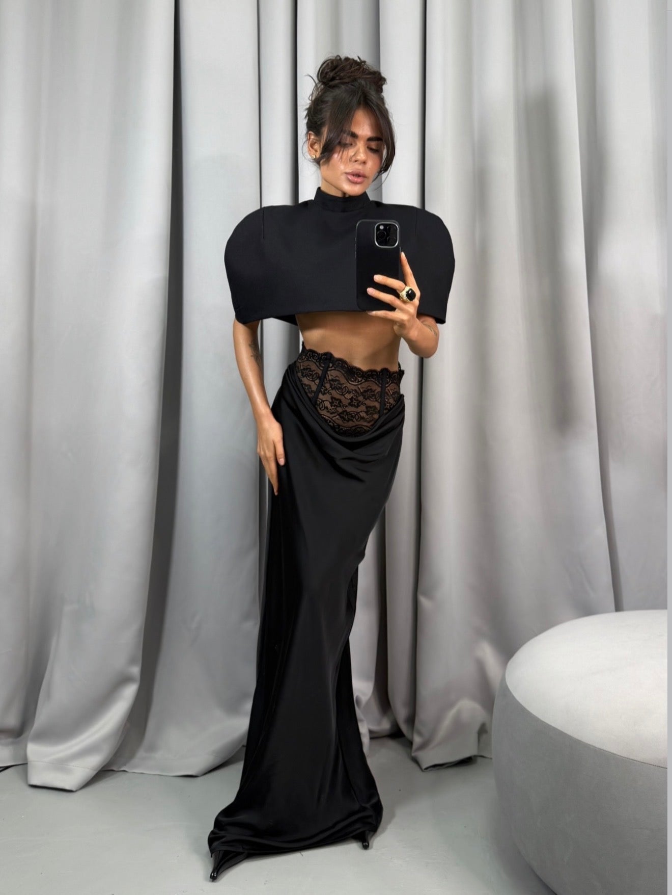 Realizată din material fin, cu cădere grea și elegantă, Fusta Noir Lace evidențiază talia și alungește optic silueta. Drapajul frontal subtil creează un efect sculptural, iar inserția din dantelă fină oferă un contrast seducător și rafinat.