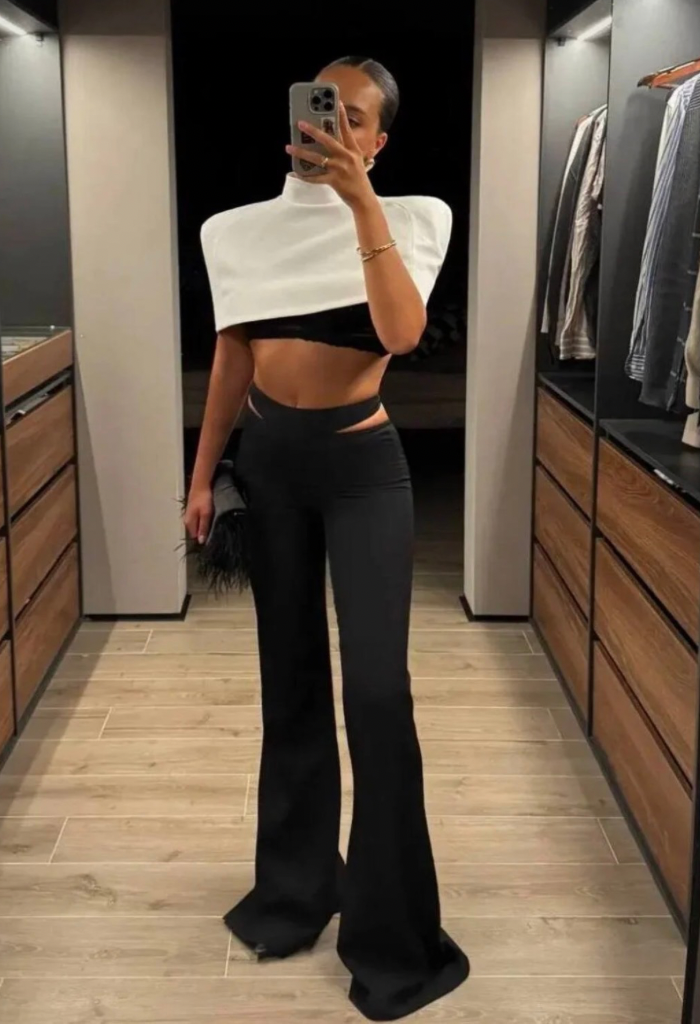 Acest compleu negru din două piese este alegerea perfectă pentru femeile care își doresc un look îndrăzneț, feminin și extrem de actual. Format dintr-un top cropped cu umeri accentuați, completat de pantaloni cu croială evazată și decupaje în talie, outfitul evidențiază perfect silueta și oferă un aer sofisticat, dar provocator.