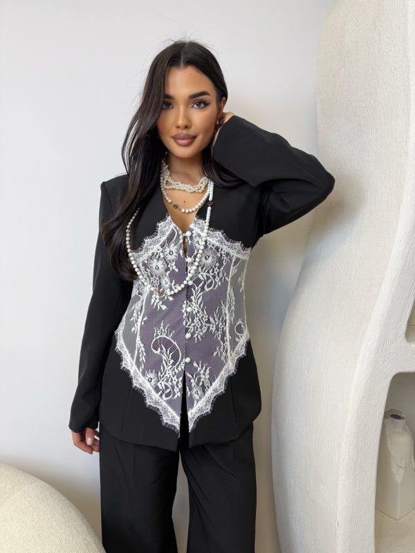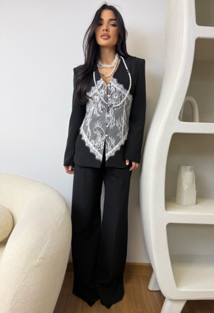 Un costum care îmbină rafinamentul clasic cu un detaliu spectaculos. Sacoul  este pus în valoare de aplicația din dantelă alba cu design floral, care conturează talia și creează un efect feminin, sofisticat și extrem de elegant.