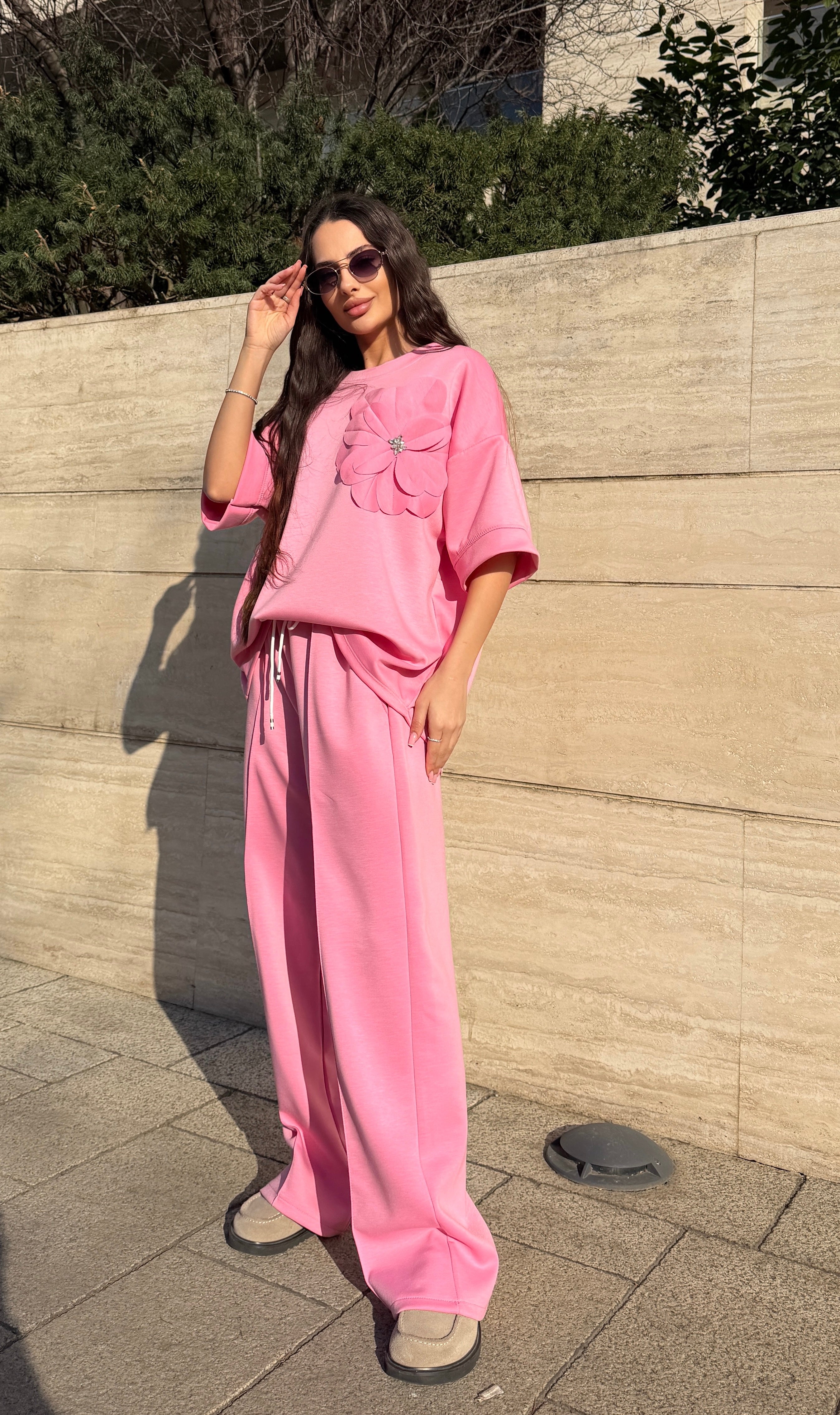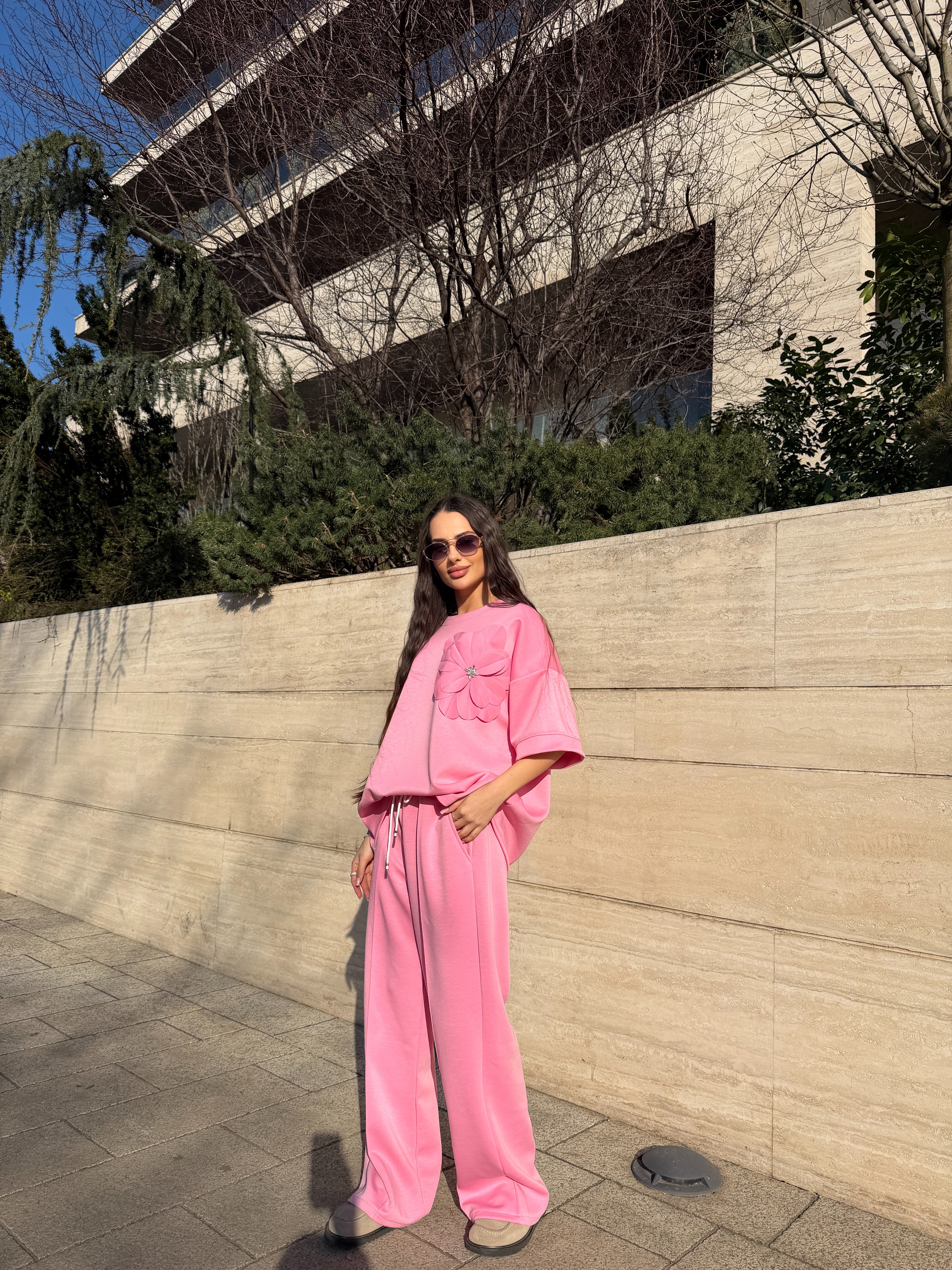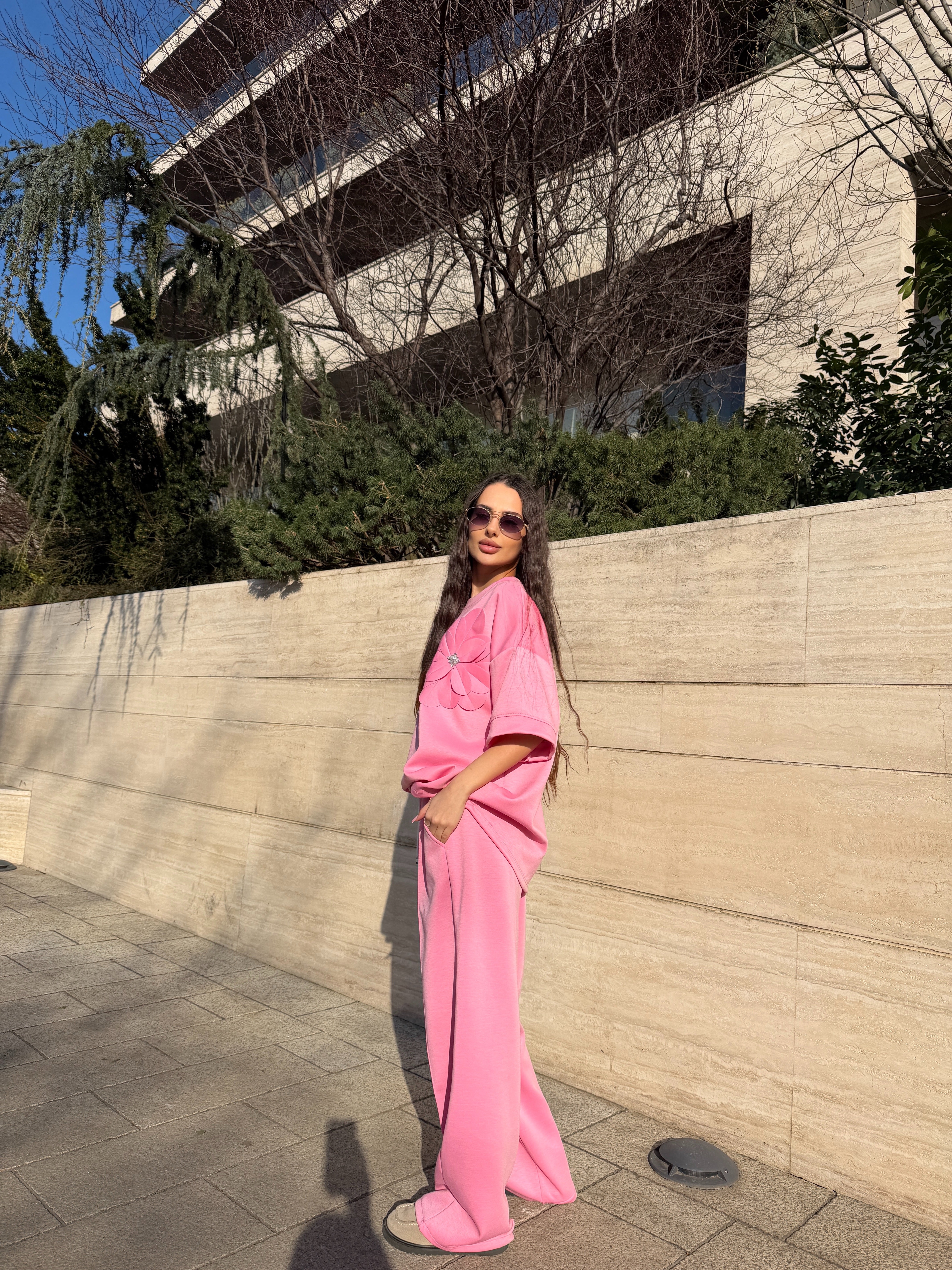 Compleul Fleur este o piesă feminină și modernă, perfectă pentru femeile care își doresc un outfit confortabil, dar în același timp stylish. Setul este compus din două piese: tricou oversized cu mânecă scurtă și pantaloni lungi cu croială lejeră, realizate într-o nuanță delicată de roz.