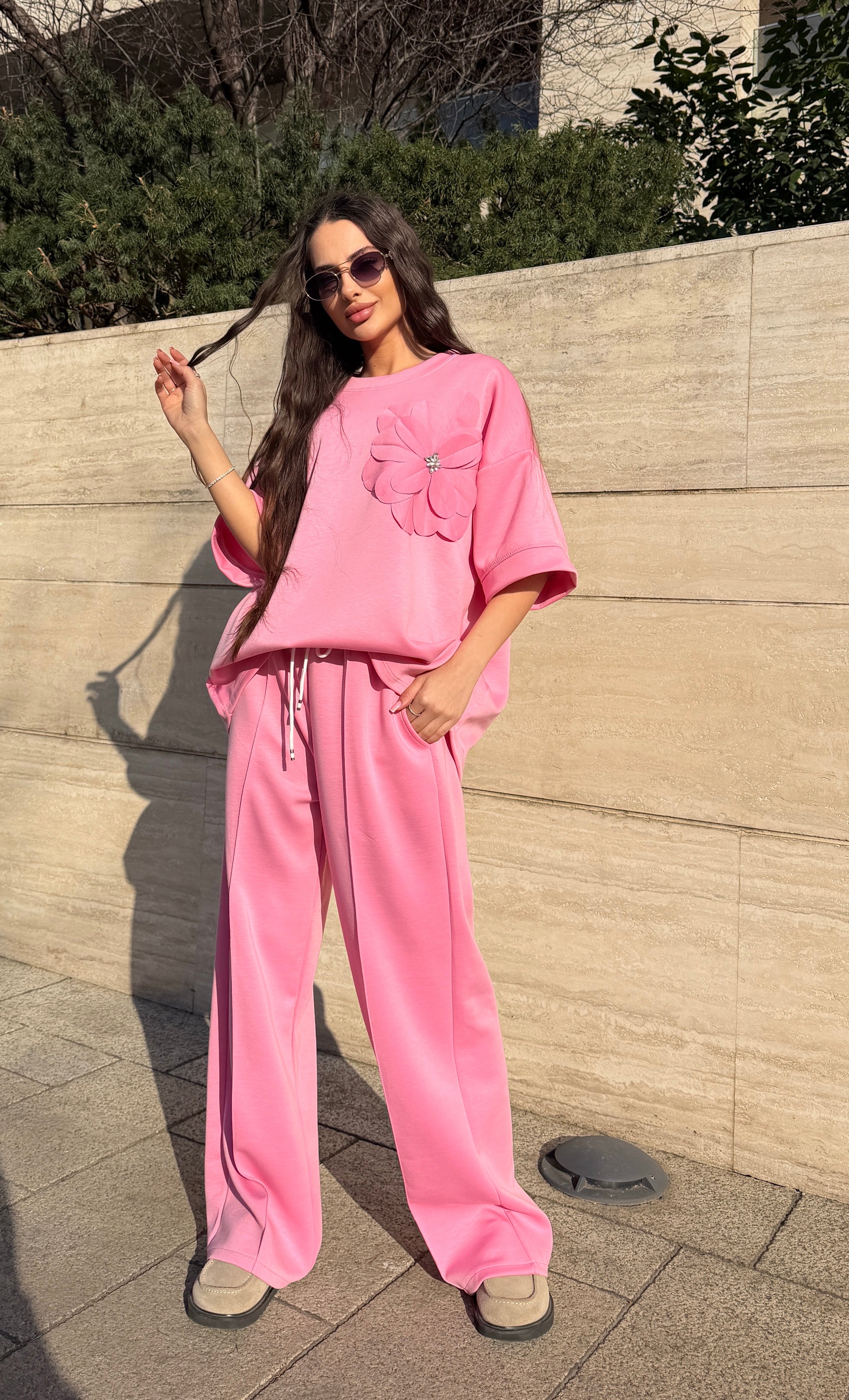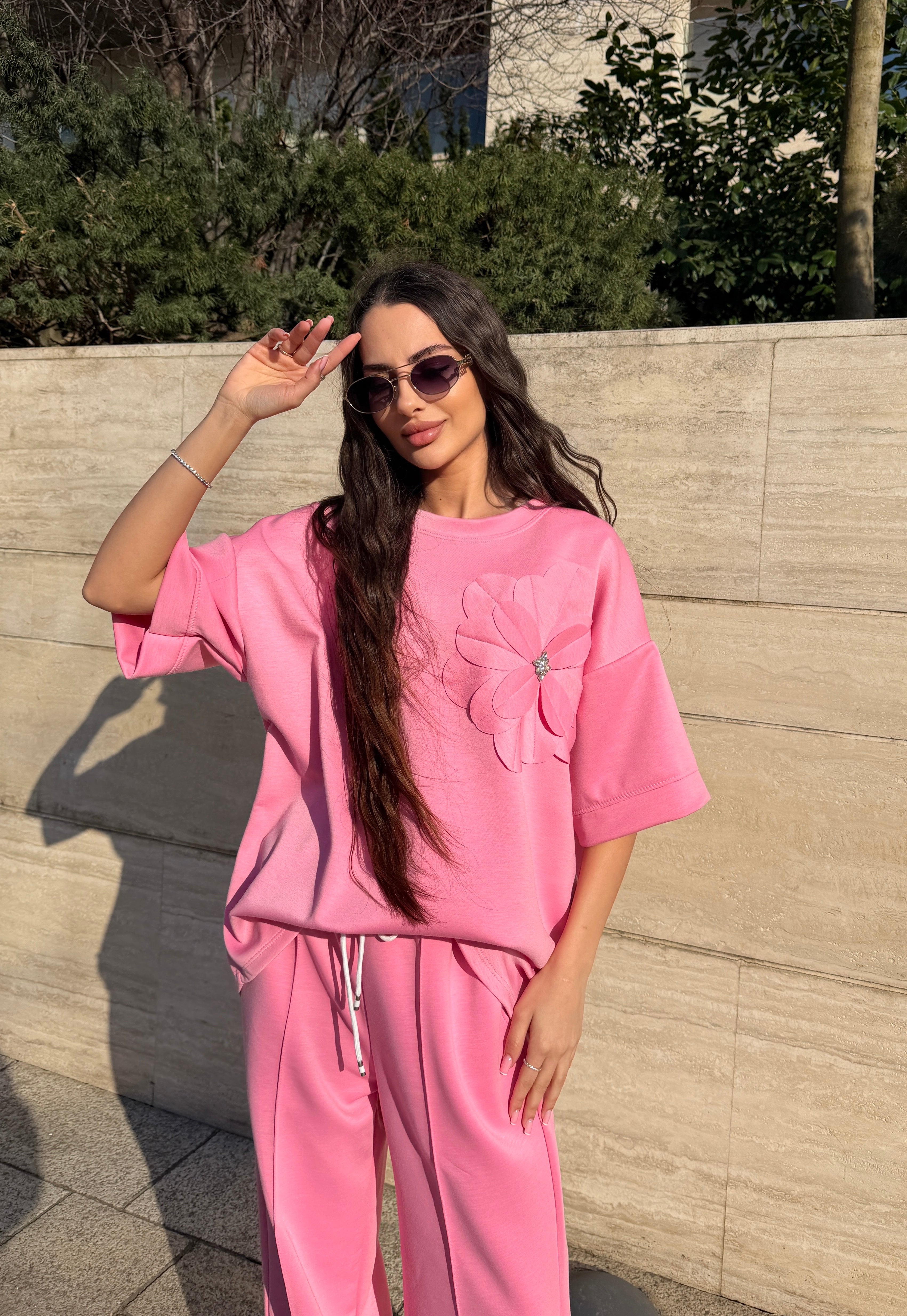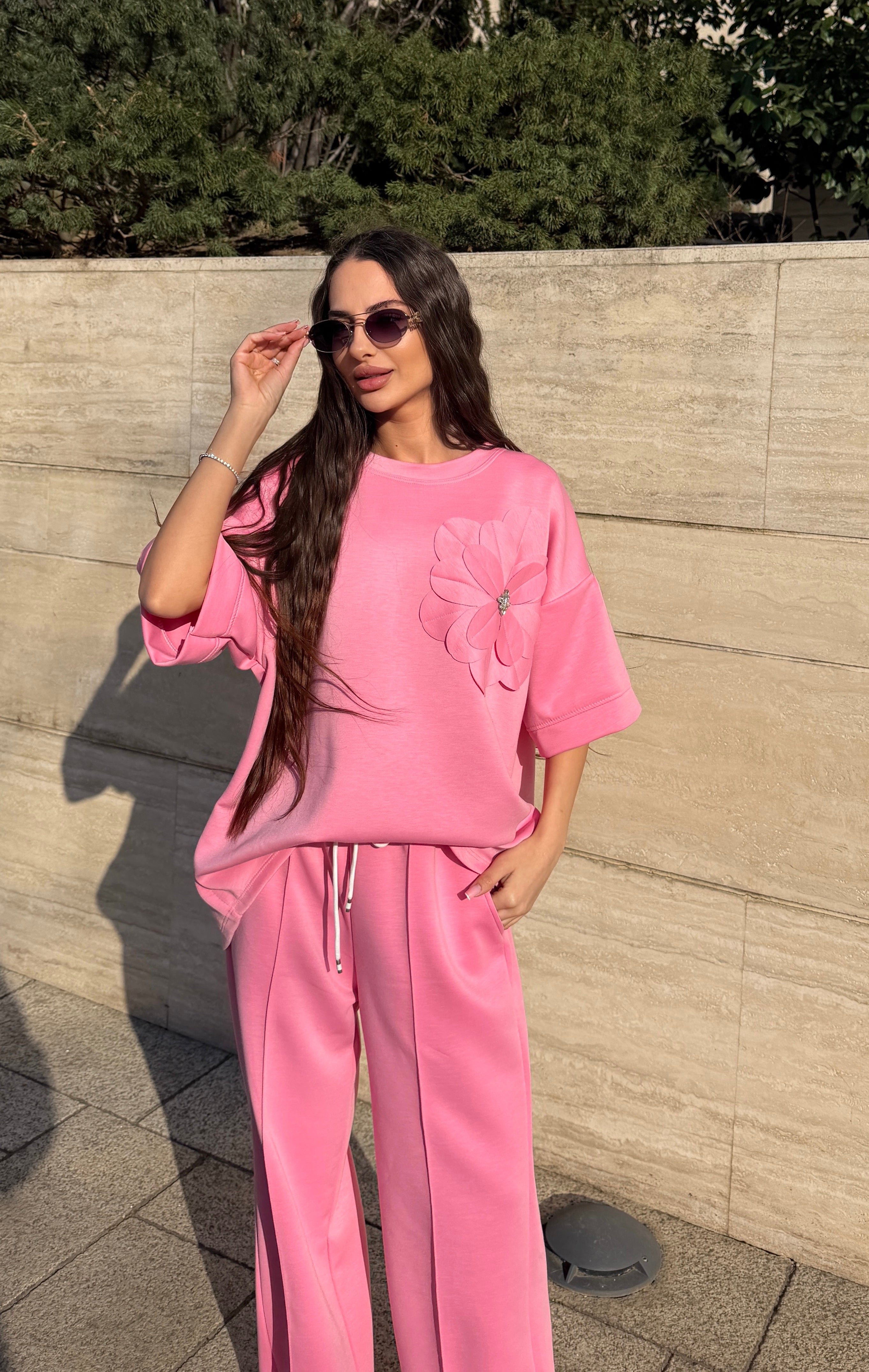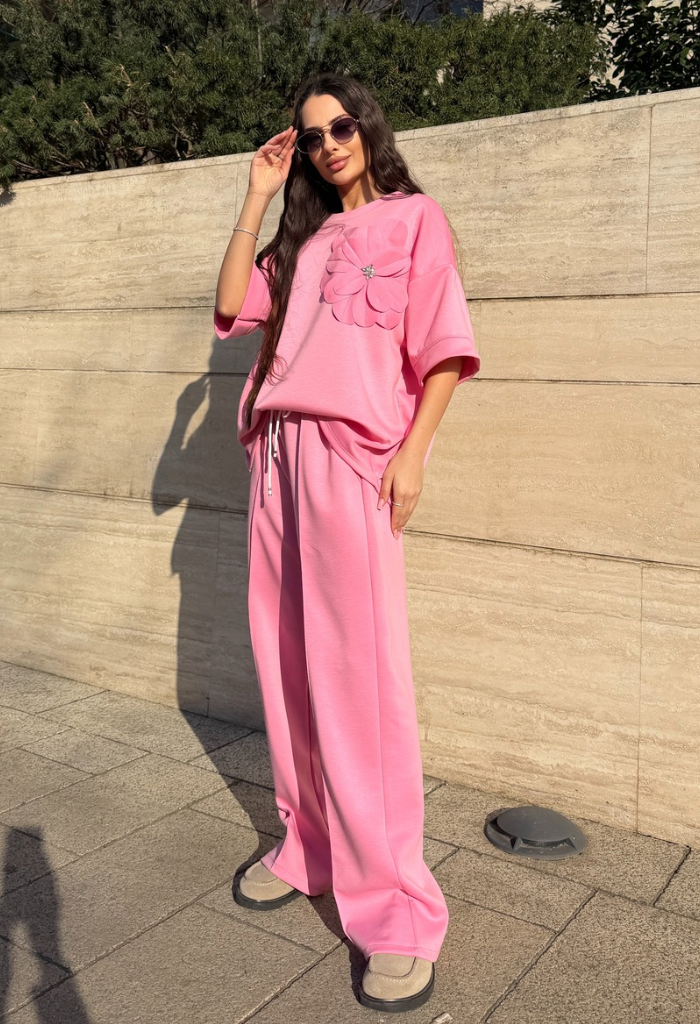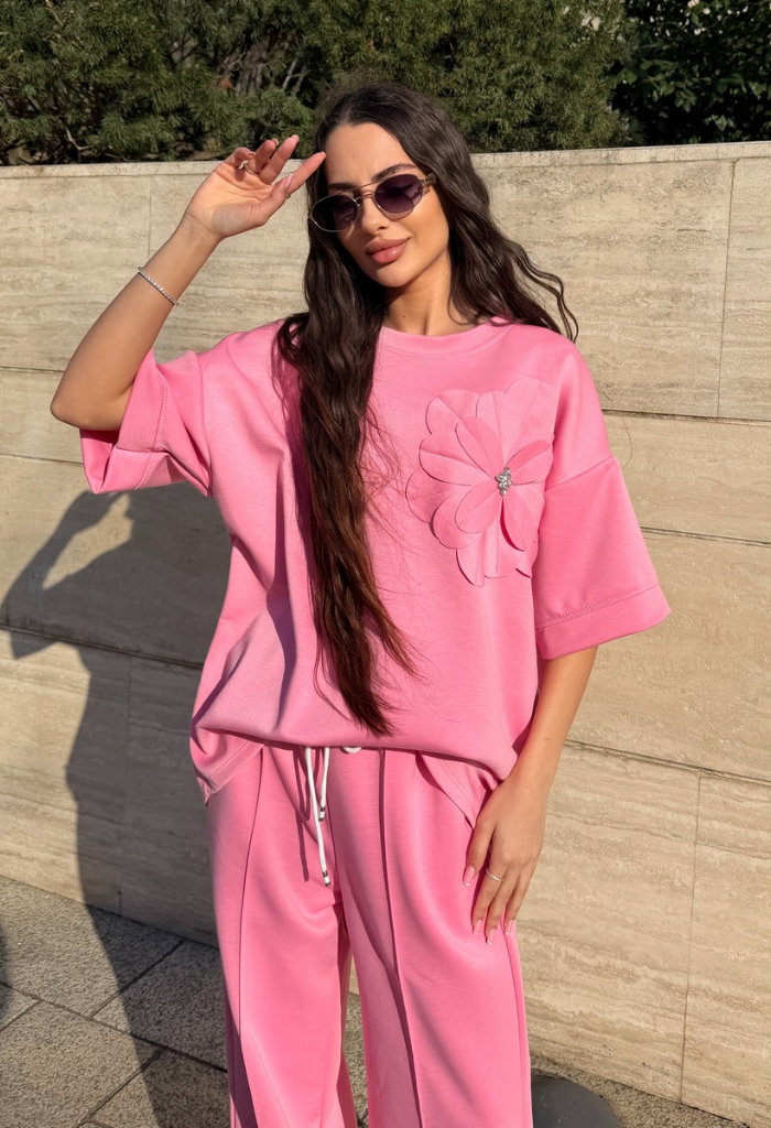 Elementul care face acest compleu special este floarea aplicată 3D din zona bustului, un detaliu elegant care oferă ținutei un aer romantic și sofisticat. Pantalonii au talie elastică cu șnur reglabil și buzunare laterale, oferind confort și libertate de mișcare pe tot parcursul zilei.