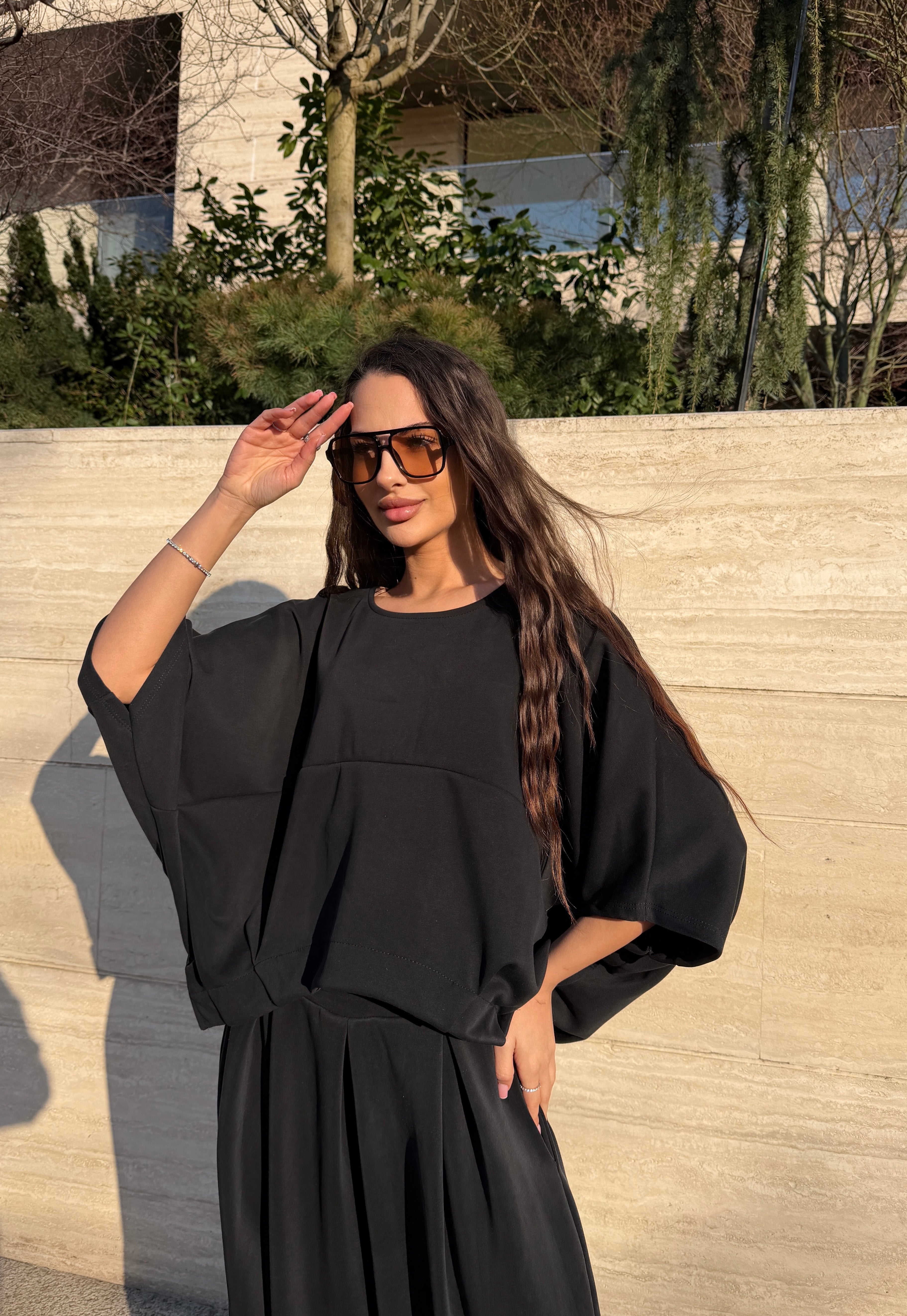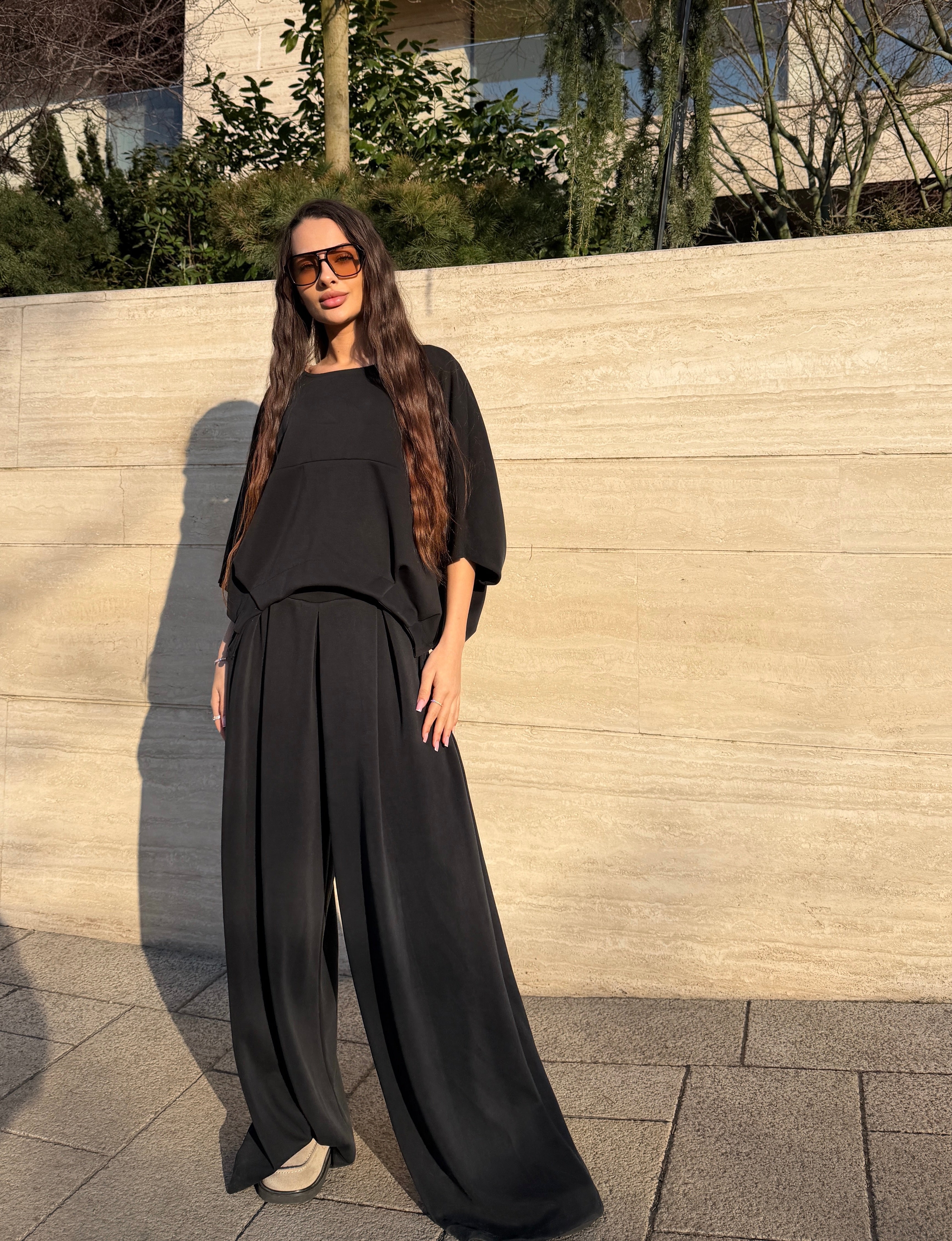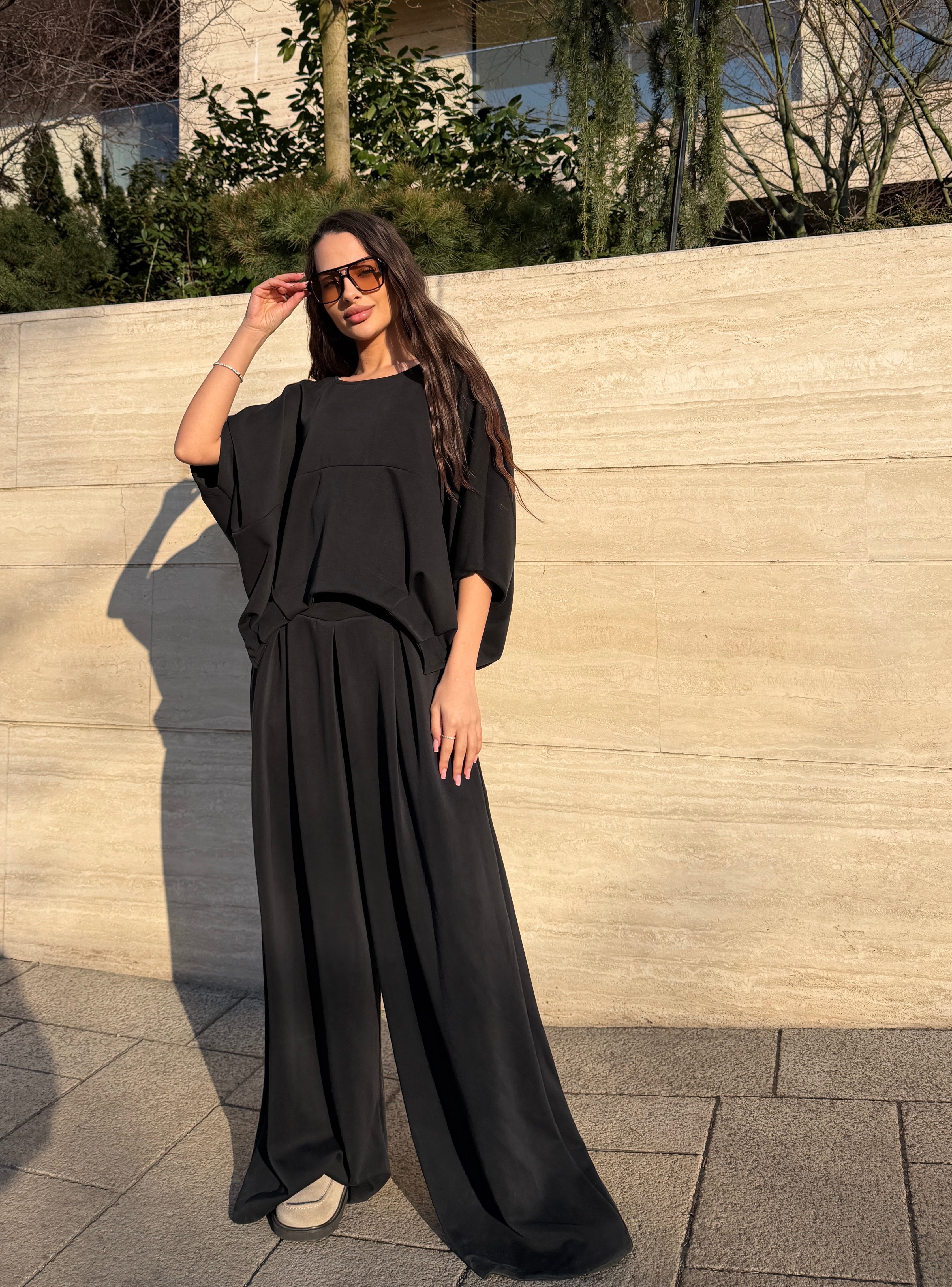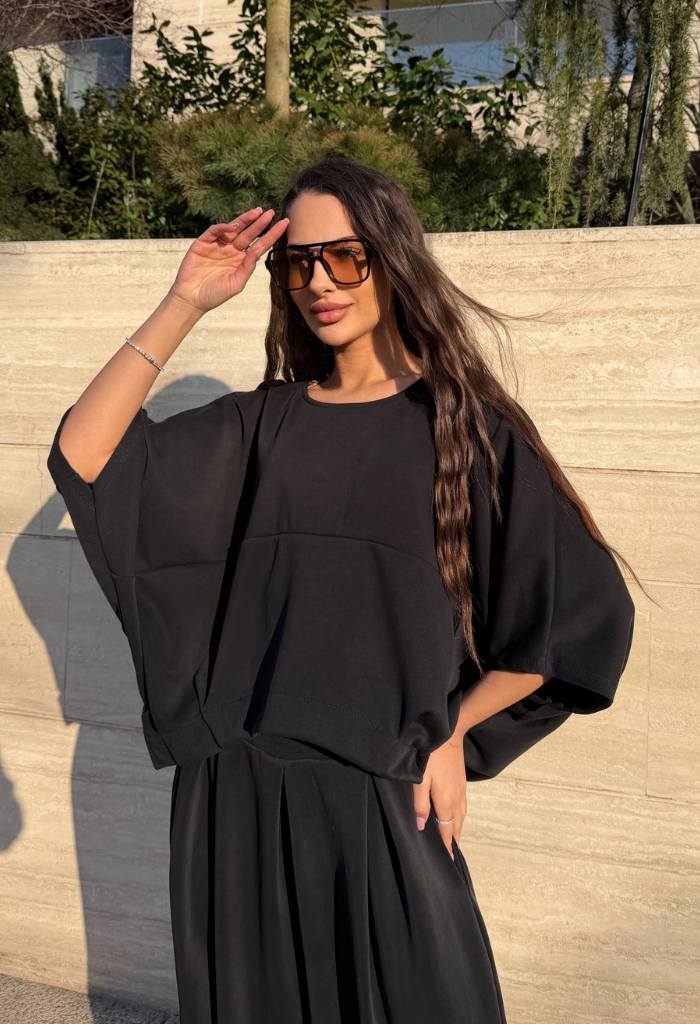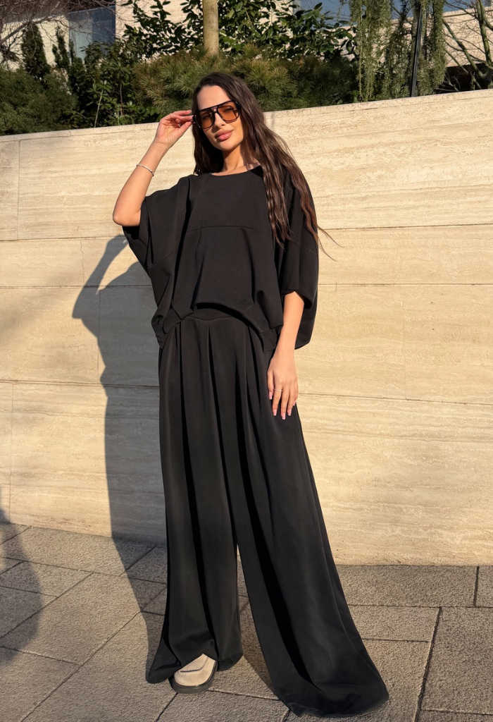 Acest compleu feminin impresionează prin designul său modern și elegant, fiind alegerea perfectă pentru femeile care își doresc confort fără să renunțe la stil. Setul este compus dintr-un top lejer cu croială amplă și mâneci largi, combinat cu pantaloni cu talie înaltă și croi fluid, care alungesc vizual silueta și oferă o eleganță naturală.