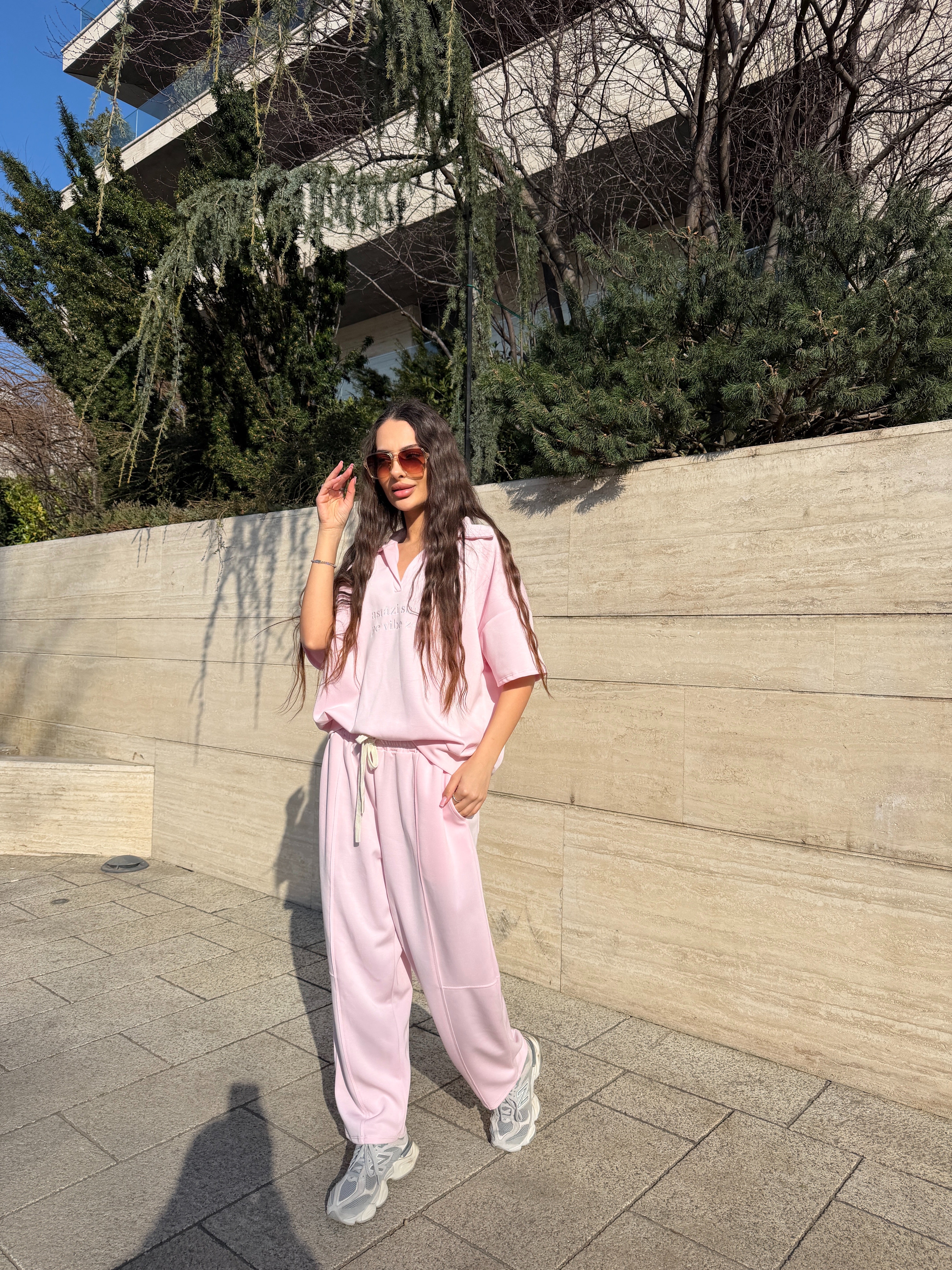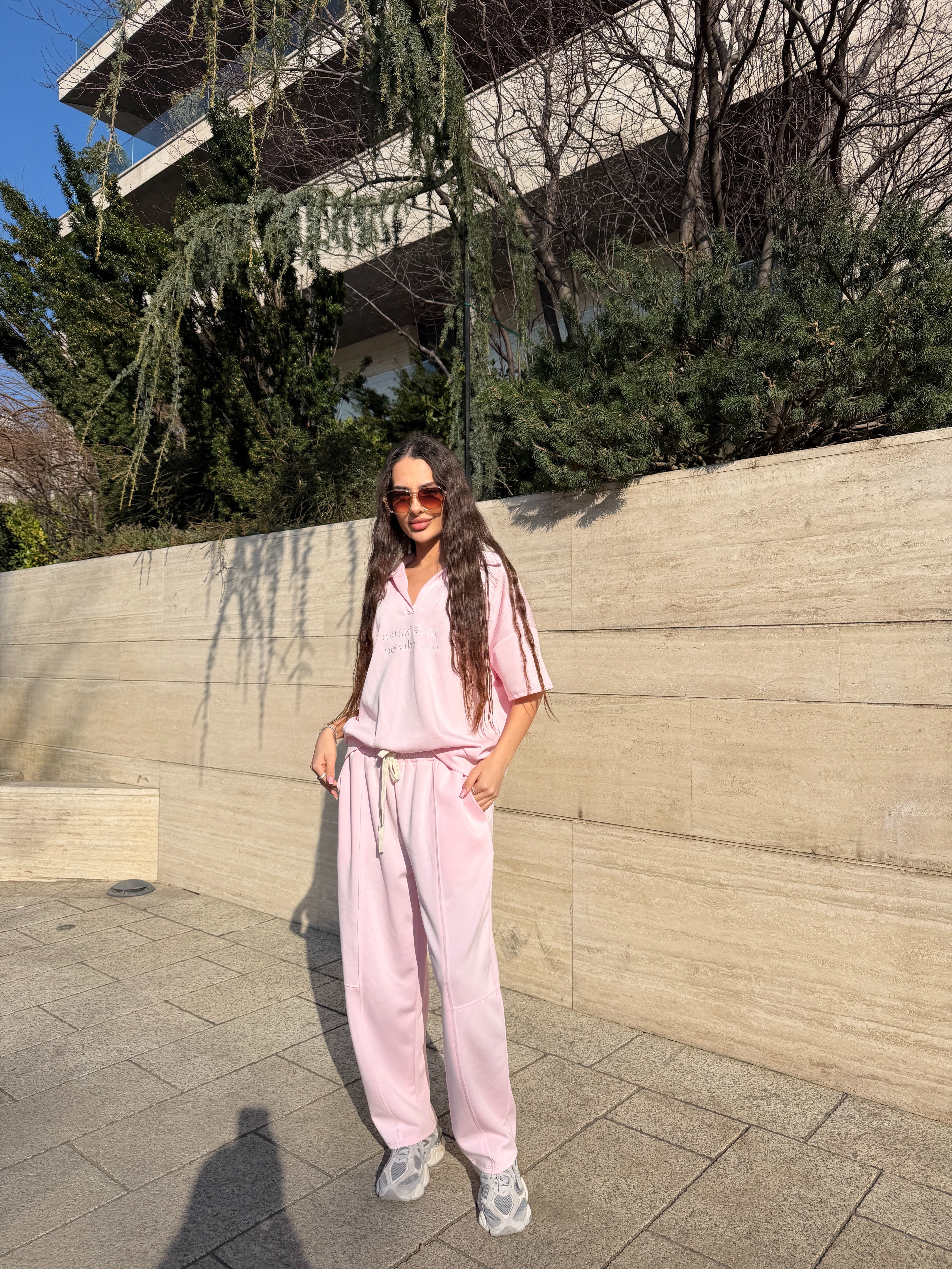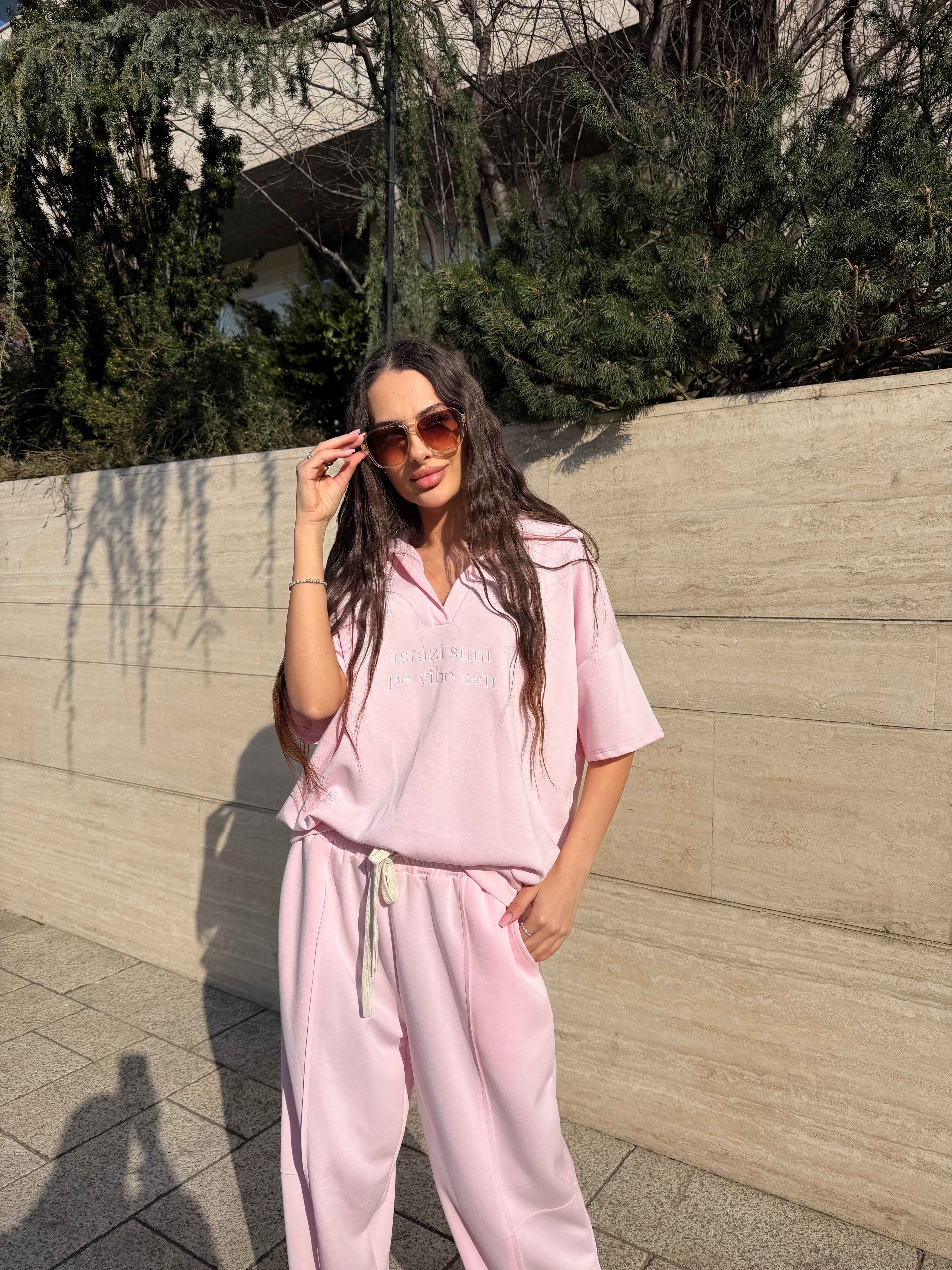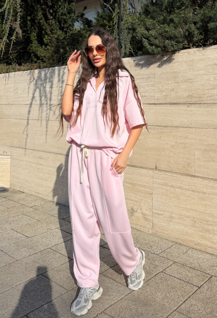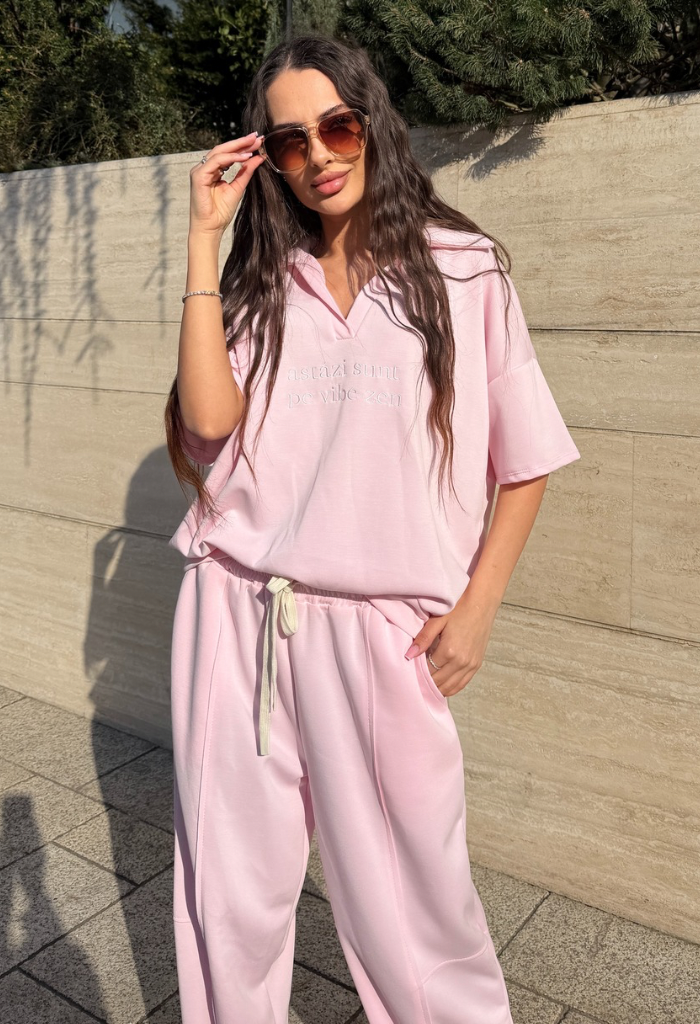 Compleul sport „Vibe Zen” este alegerea perfectă pentru un look casual modern, relaxat și stilat. Realizat din material moale și plăcut la atingere, acest set format din tricou oversized și pantaloni lejeri cu talie elastică oferă libertate de mișcare și confort pe tot parcursul zilei. Nuanța delicată de roz pastel adaugă un aer feminin și fresh, perfect pentru ținute de zi, plimbări în oraș sau outfituri relaxate de weekend.