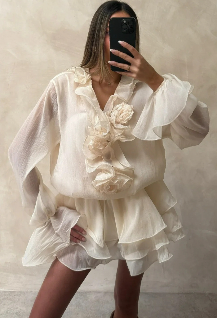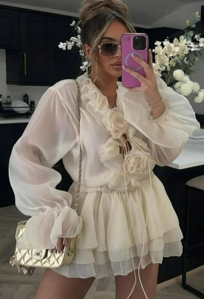 Mânecele lungi vaporoase sunt completate de detalii florale elegante, care transformă rochia într-o piesă statement, perfectă pentru evenimente, ieșiri în oraș sau ținute speciale.
