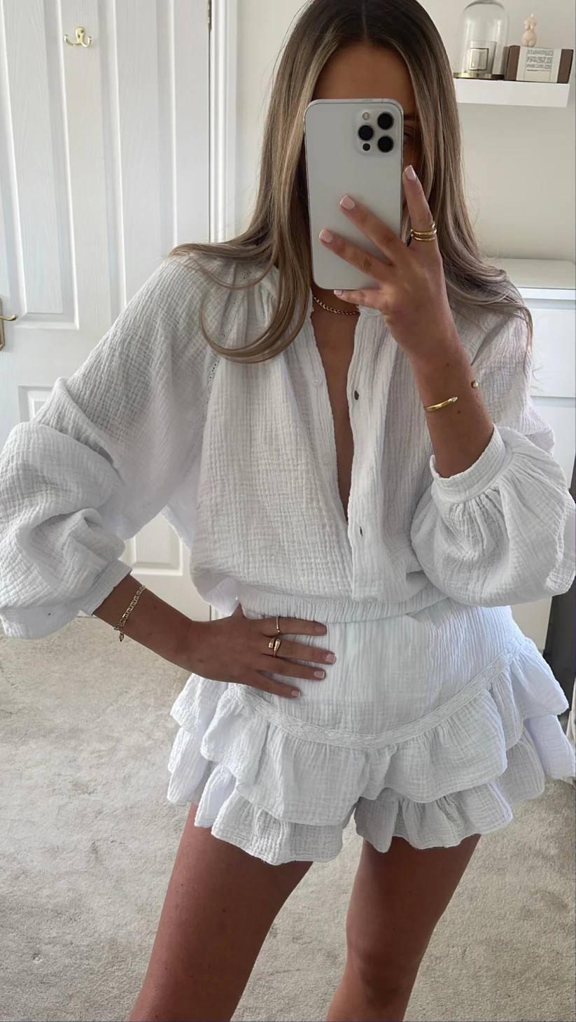 Rochie scurtă alba cu volane Livia – rochie vaporoasă de vară cu talie elastică